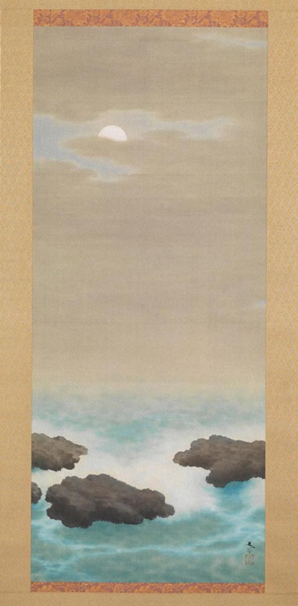 菱田春草(1874〜1911)は、明治39年、横山大観、下村観山、木村武山(ぶざん)とともに、岡倉天心に従って茨城県五浦(いづら)に移住しました。日本美術院の都落ちと揶揄されたものでしたが、海に面した崖の上の画室で作画に専心し競作したことは、互いに有益な刺激となったはずであり、春草は線を排除したいわゆる朦朧体(もうろうたい)の実験を突き進めていきました。 雲間から現れた満月の光が、岩と波とを一瞬浮かび上がらせた印象が、鮮やかに描きとめられています。都会から離れた環境を逆手に活かそうとした画家魂が貴く思われます。 間もなく病のために東京に戻った春草は、明治44年に数え年38歳の若さで没しています。