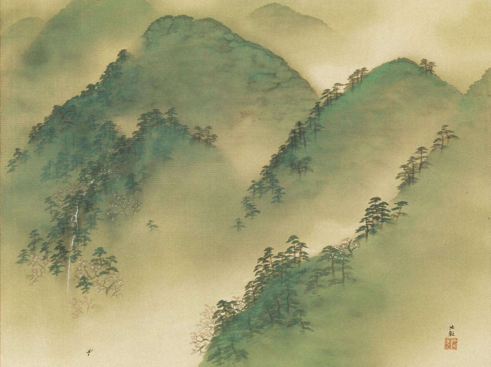 雨上がり、もやの立ちこめる京都嵐山の美しい情景を描いた作品です。ヤマザクラがわずかに残る山間に滝が流れ落ち、その下方には夏の訪れを告げるホトトギスが軽やかに渡っていくのが見えます。雨に濡れた山の様子がぼかしやにじみを用いて表され、潤いに満ちた初夏の山並みが再現されています。