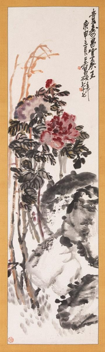 石の傍らに赤と紫の大輪の牡丹が咲いています。呉昌碩(ごしょうせき・1844~1927)は、中国近代を代表する書画家・篆刻家(てんこくか)。絵具と墨がほとばしるかのような、気魄(きはく)に満ちた筆墨は、古典の研究にもとづき鍛錬を重ねた、優れた技術に支えられています。右上に「寿昌を貴び侯王に宜し」と読める吉祥の言葉と、「庚申三月呉昌碩年七十七」という署名があります。数え年77歳、すなわち喜寿(きじゅ)に至った画家が、長寿の象徴である石に富貴の花牡丹を合わせて描いた、めでたさに満ちた一幅です。