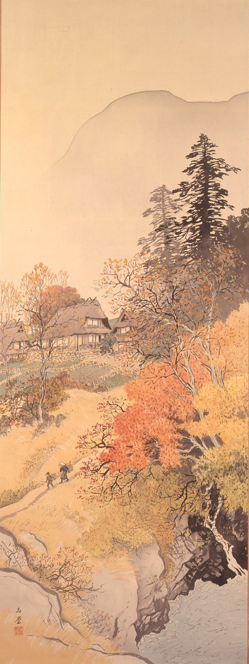 川沿いの道を母と子が籠を背負い下っていきます。野辺にはすすきが揺れ、柿が実り、畑のむこうには二人の家らしき民家が建っています。その屋根の急勾配(きゅうこうばい)のつくりから、やがて訪れる冬の雪深さが思われます。