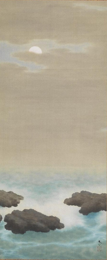 菱田春草(1874〜1911)は、明治39年、横山大観、下村観山、木村武山(ぶざん)とともに、岡倉天心に従って茨城県五浦(いづら)に移住しました。日本美術院の都落ちと揶揄されたものでしたが、海に面した崖の上の画室で作画に専心し競作したことは、互いに有益な刺激となったはずであり、春草は線を排除したいわゆる朦朧体(もうろうたい)の実験を突き進めていきました。 雲間から現れた満月の光が、岩と波とを一瞬浮かび上がらせた印象が、鮮やかに描きとめられています。都会から離れた環境を逆手に活かそうとした画家魂が貴く思われます。 間もなく病のために東京に戻った春草は、明治44年に数え年38歳の若さで没しています。