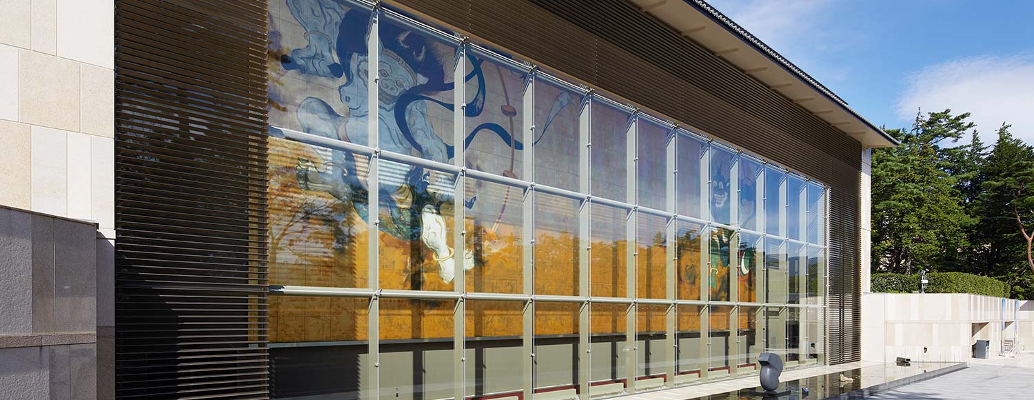 분위기 있는 오래된 유리문 너머에는 잉어가 헤엄치는 연못과 푸른 나무들이 펼쳐집니다.