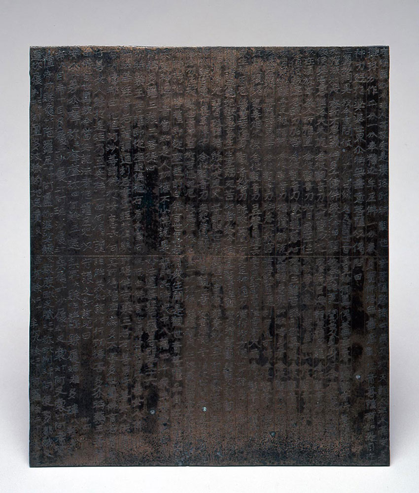この銅板法華経は、大分県豊後高田市の長安寺に伝来する『銅板法華経』(全37枚、現在は19枚)の1枚と考えられ、同じくその1枚とされる東京国立博物館所蔵作品の銘文によって、保延7年(1141)に制作されたものと分かります。書写した経典を地中に埋める「埋経(まいきょう)」の中でも、大変珍しい形式の貴重な一点です。