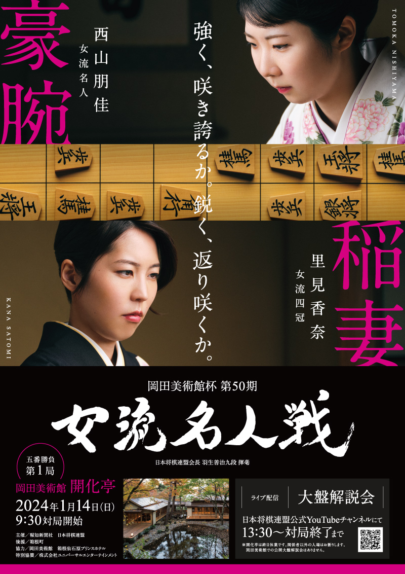 岡田美術館では、2024年1月14日(日)、将棋の岡田美術館杯 第50期女流名人戦 五番勝負第1局(西山朋佳女流名人 対 里見香奈女流四冠)を開催いたします。