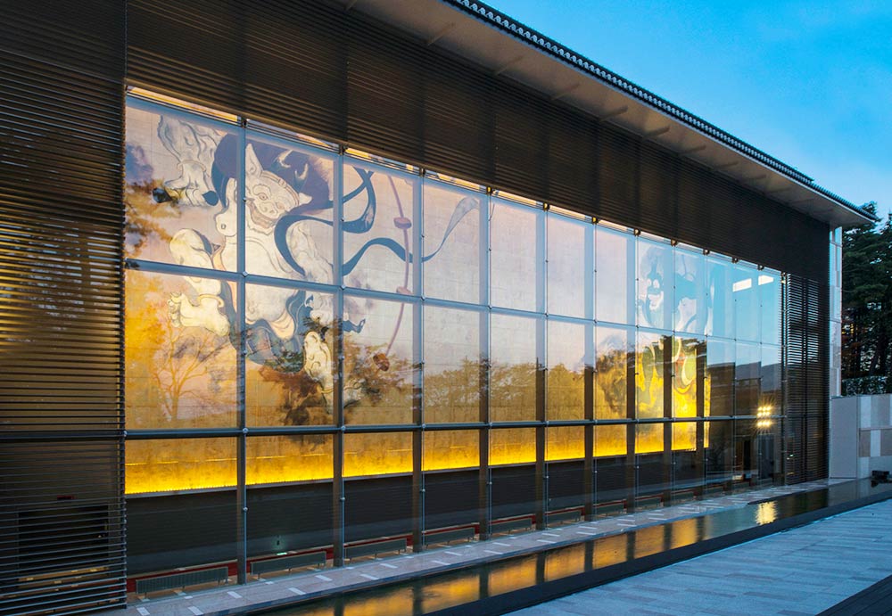富於裝飾性的日本美的傳統,自桃山時代以來,主要被琳派藝術家們所承傳下來。而被認為是這個傳統源流的俵屋宗達,其代表作中有一件名為「風神雷神圖屏風」(京都・建仁寺藏)的國寶。在俵屋宗達之後的繼承者,如尾形光琳與酒井抱一,雖然也曾幾度挑戰摹寫與仿作,但與原作相比都是些尺寸稍小的屏風畫。400年後的今天,於本館正面,長12米、寬30米,由福井江太郎先生所創作的巨幅壁畫「風・刻」(風與時間),富創造性地再現了「風神雷神圖」原作的風貌。